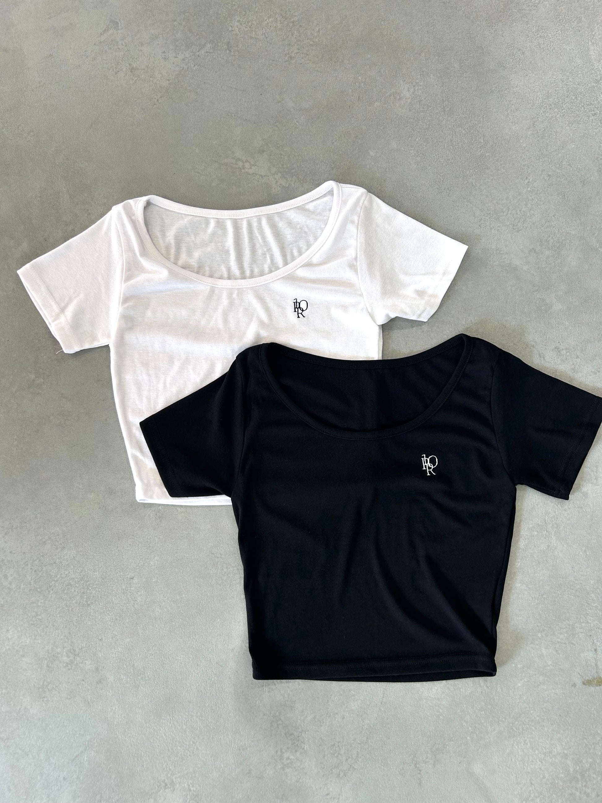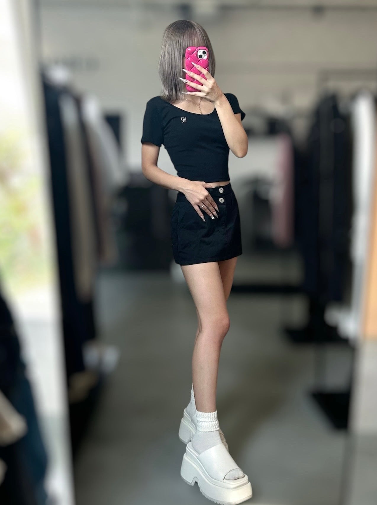 深めのスクエアネックがデコルテを綺麗に見せるクロップドTシャツ