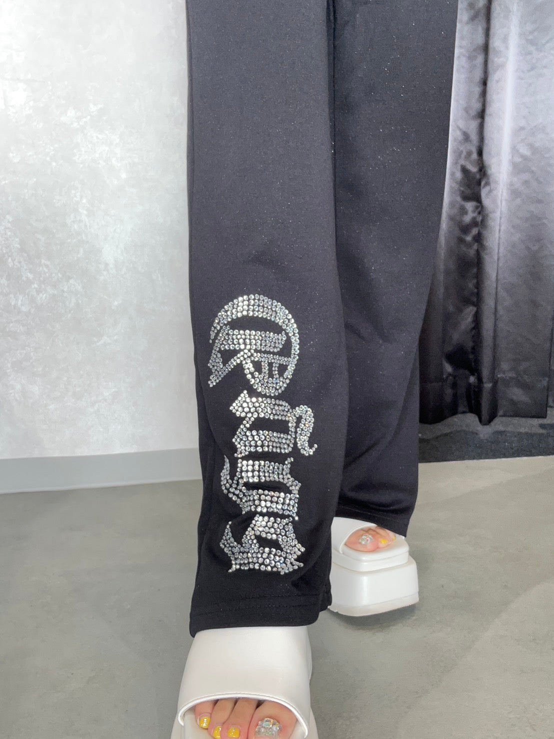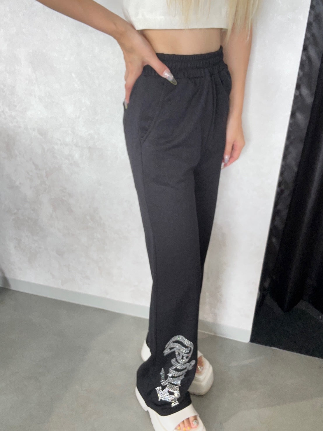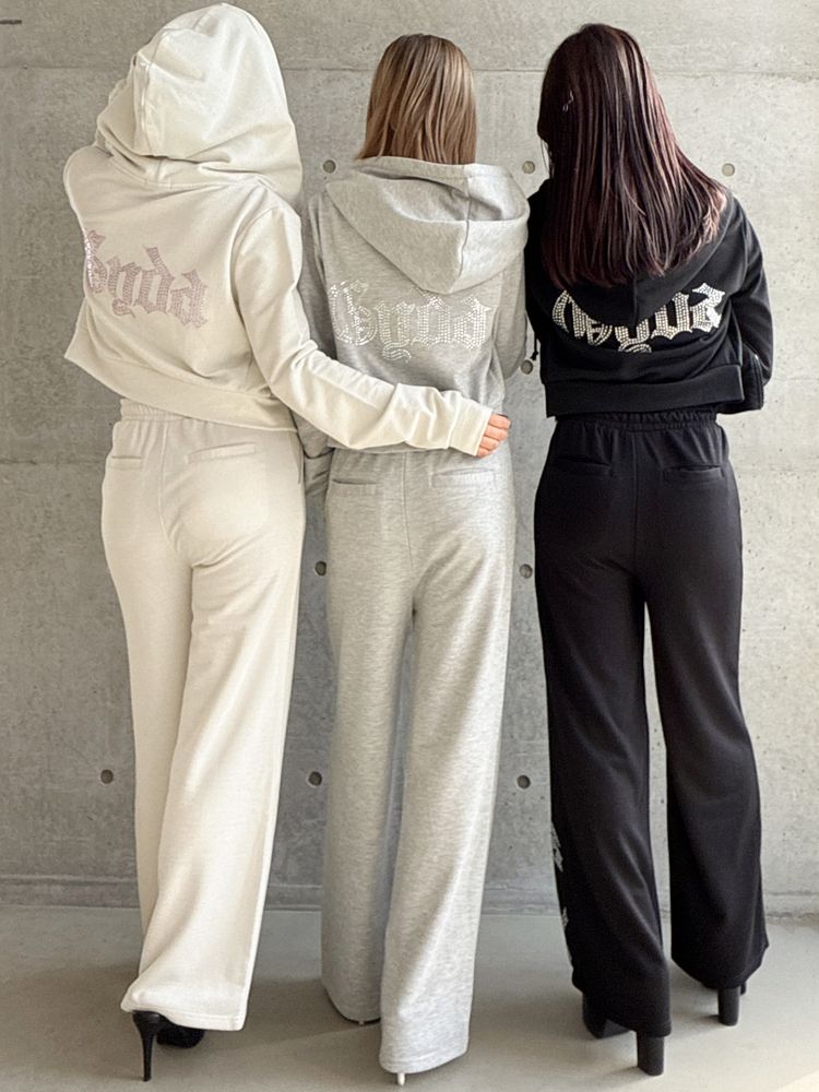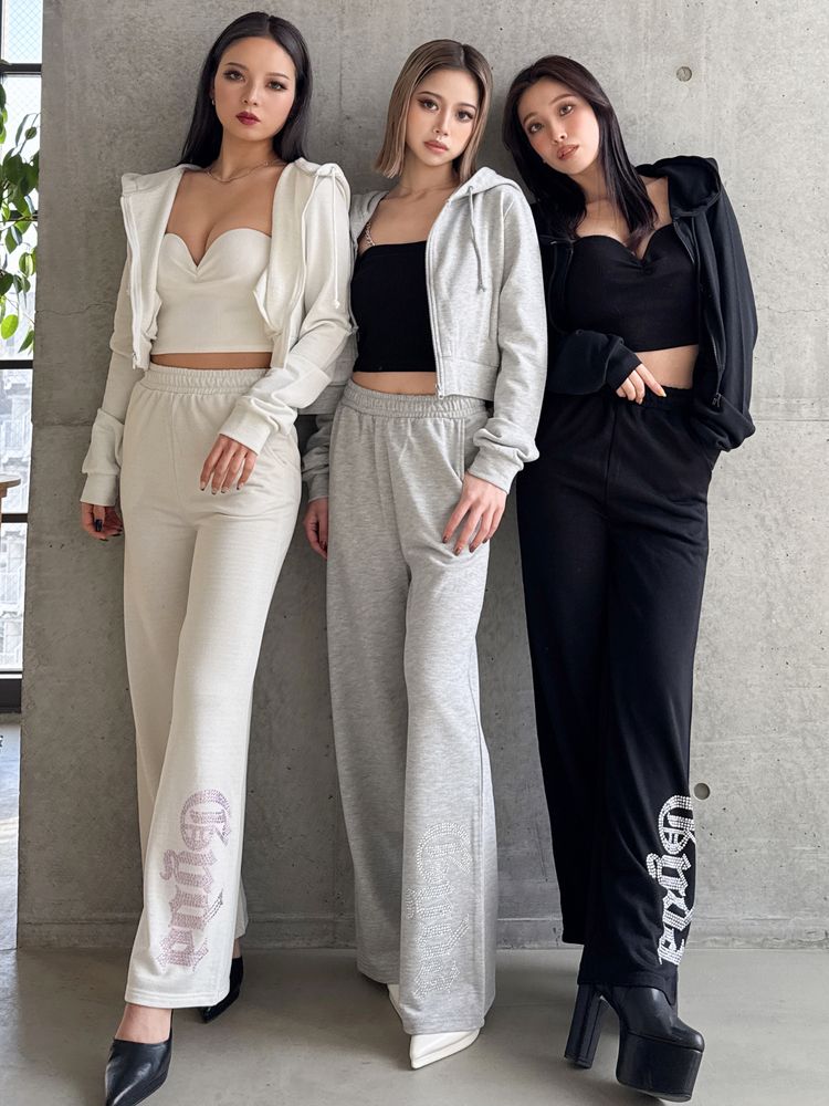 のラメ素材×ラインストーンロゴのフルレングスパンツが登場! ラインストーンのキラキラしたが