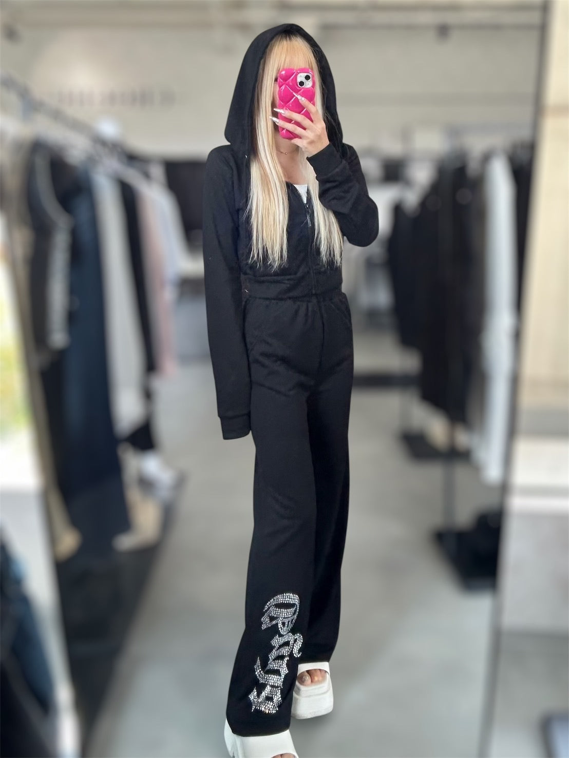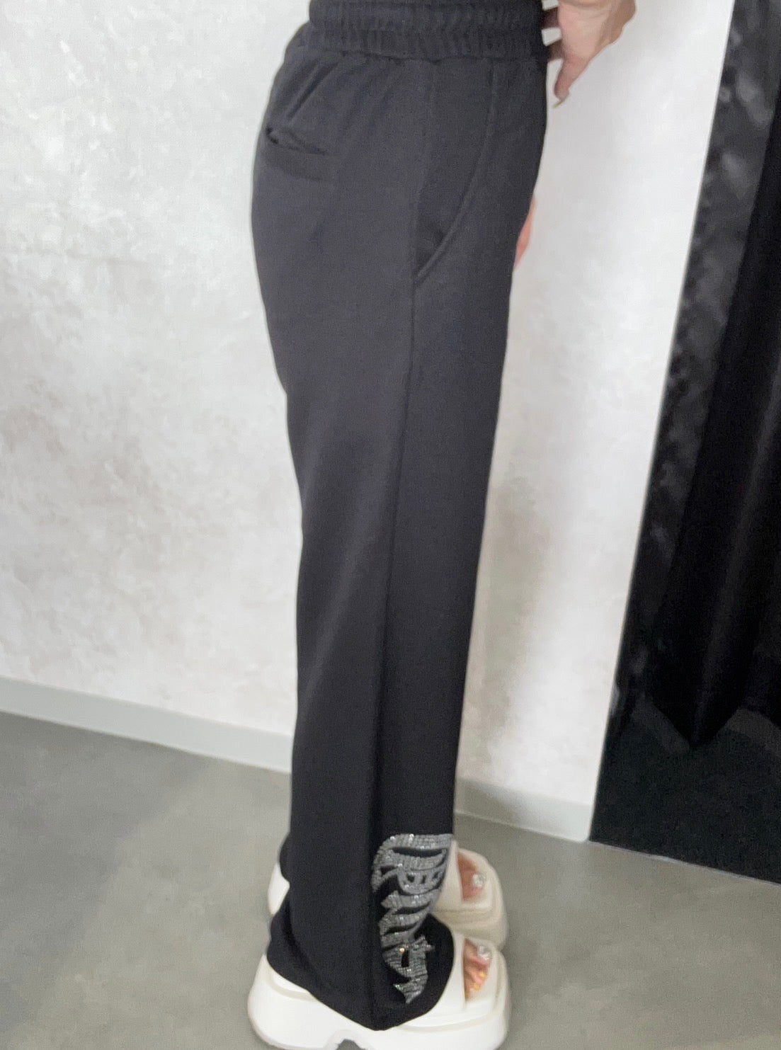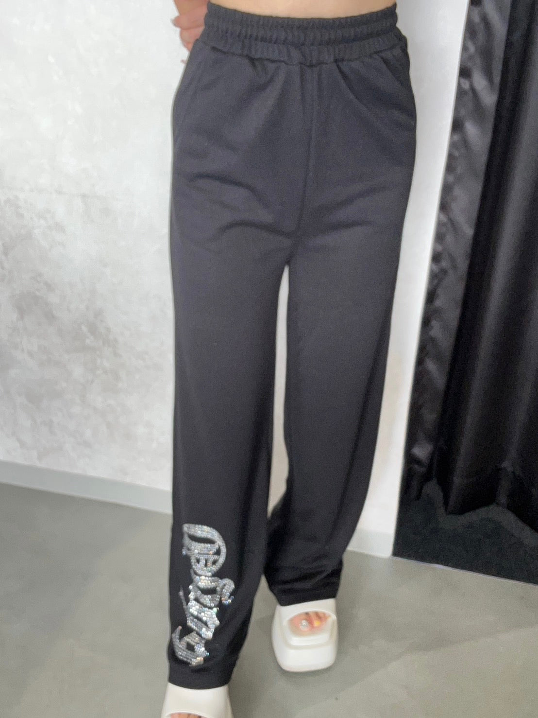 のラメ素材×ラインストーンロゴのフルレングスパンツが登場! ラインストーンのキラキラしたが