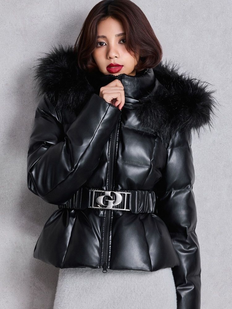 GYDA GDベルト付きフェイクレザーショートダウンコート