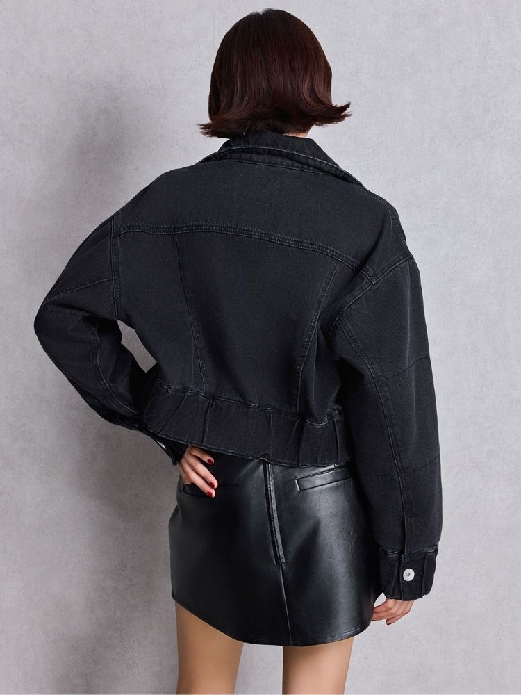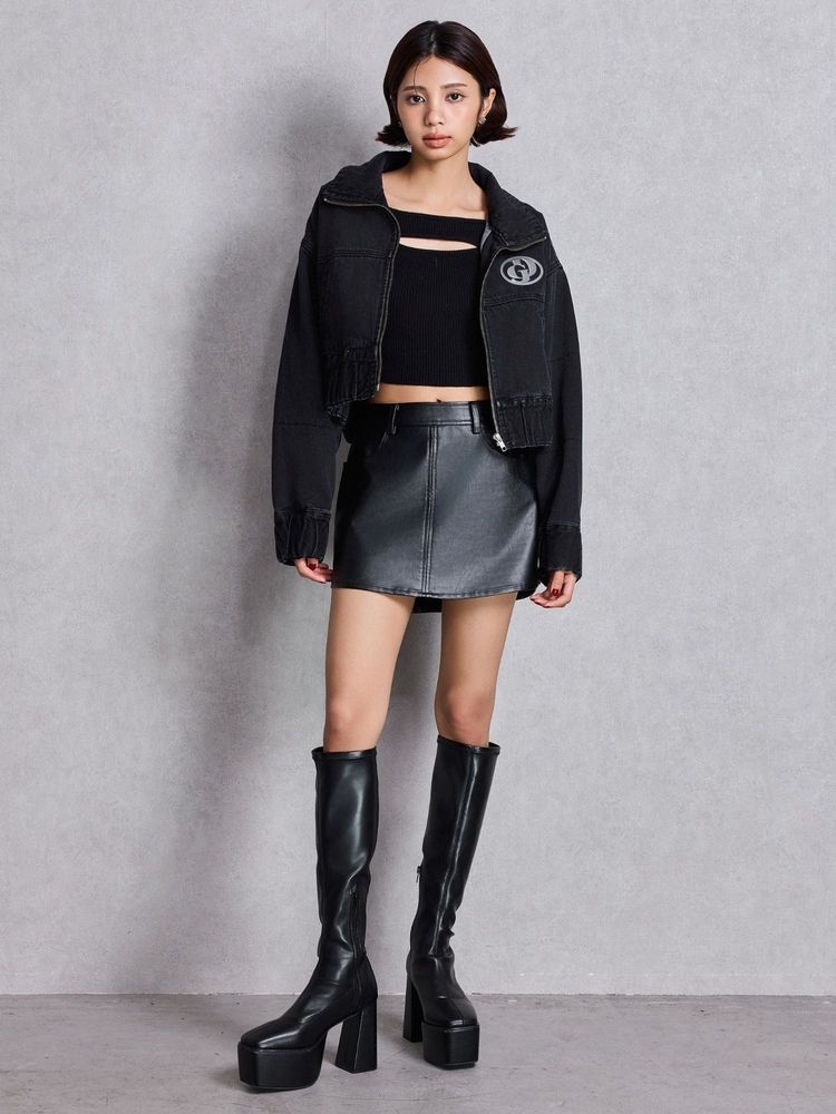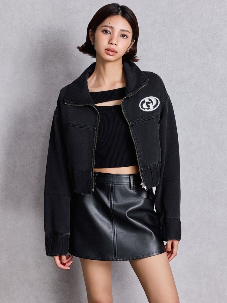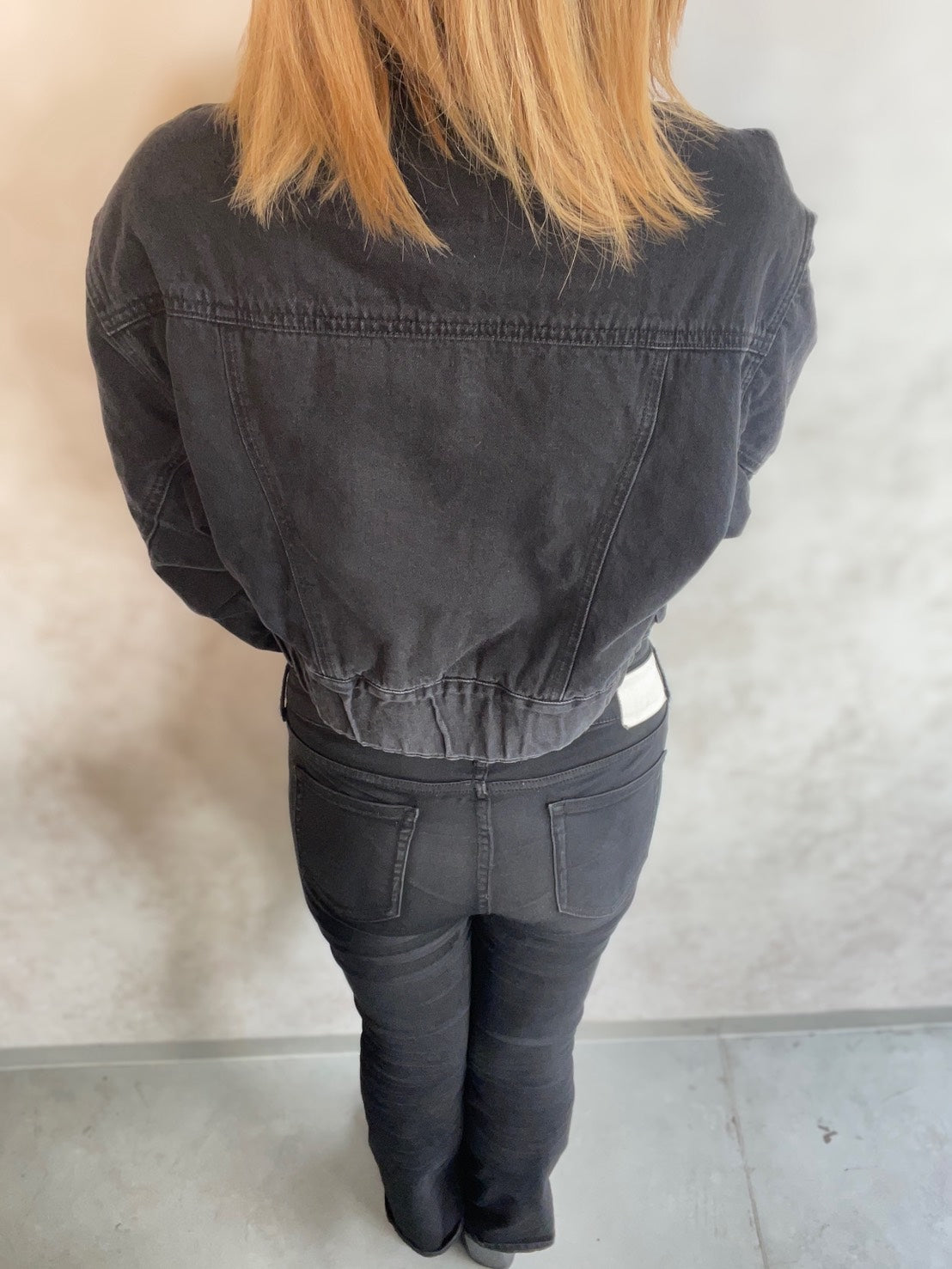 デニム生地を使用し、クロップド丈と切り替えステッチ、