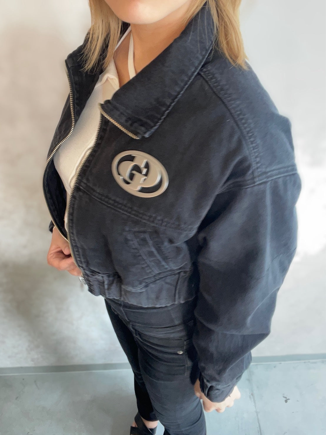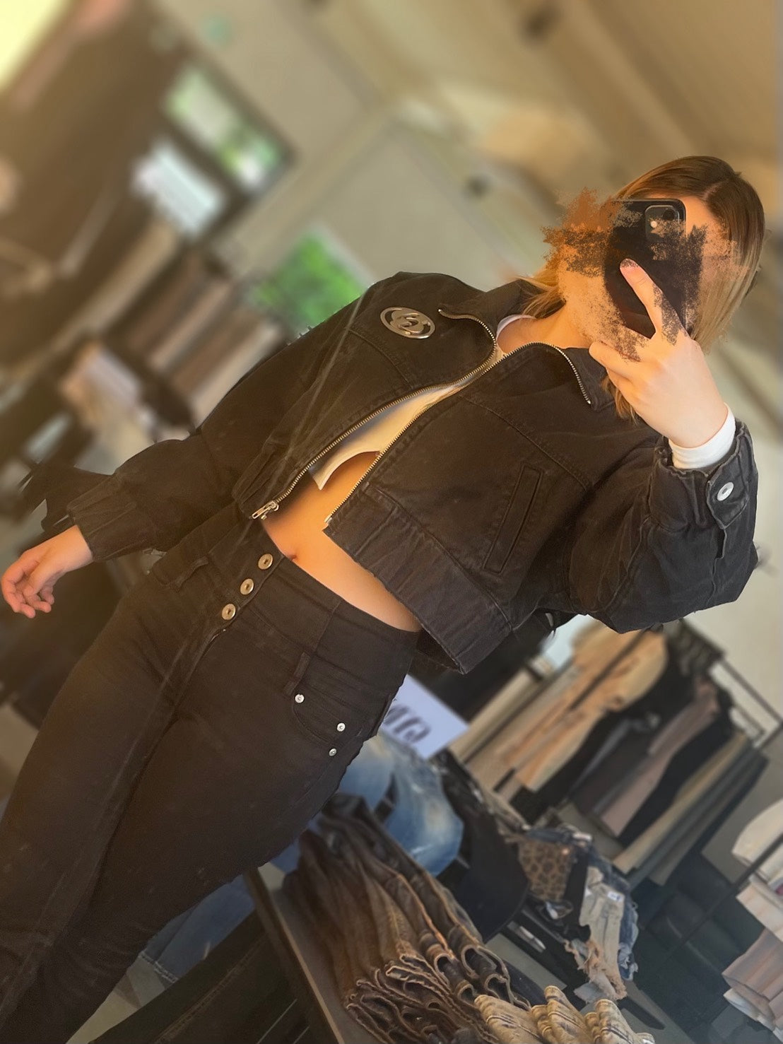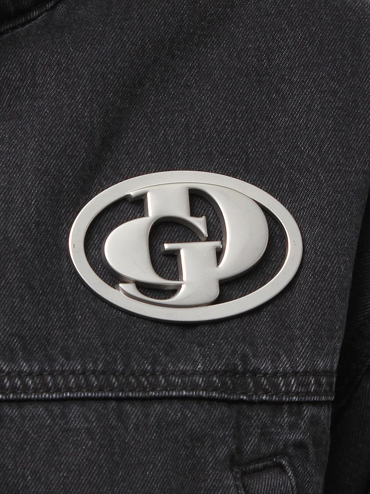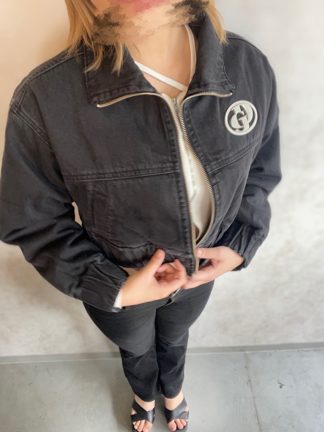 デニム生地を使用し、クロップド丈と切り替えステッチ、