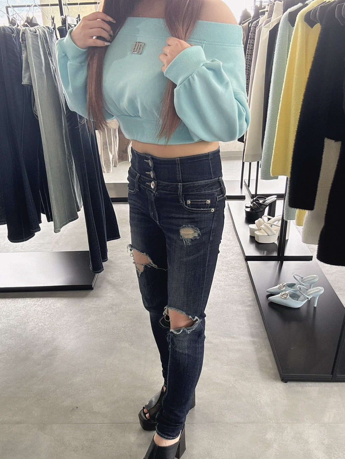 ショート丈なのでハイウエストのボトムとの相性抜群です。