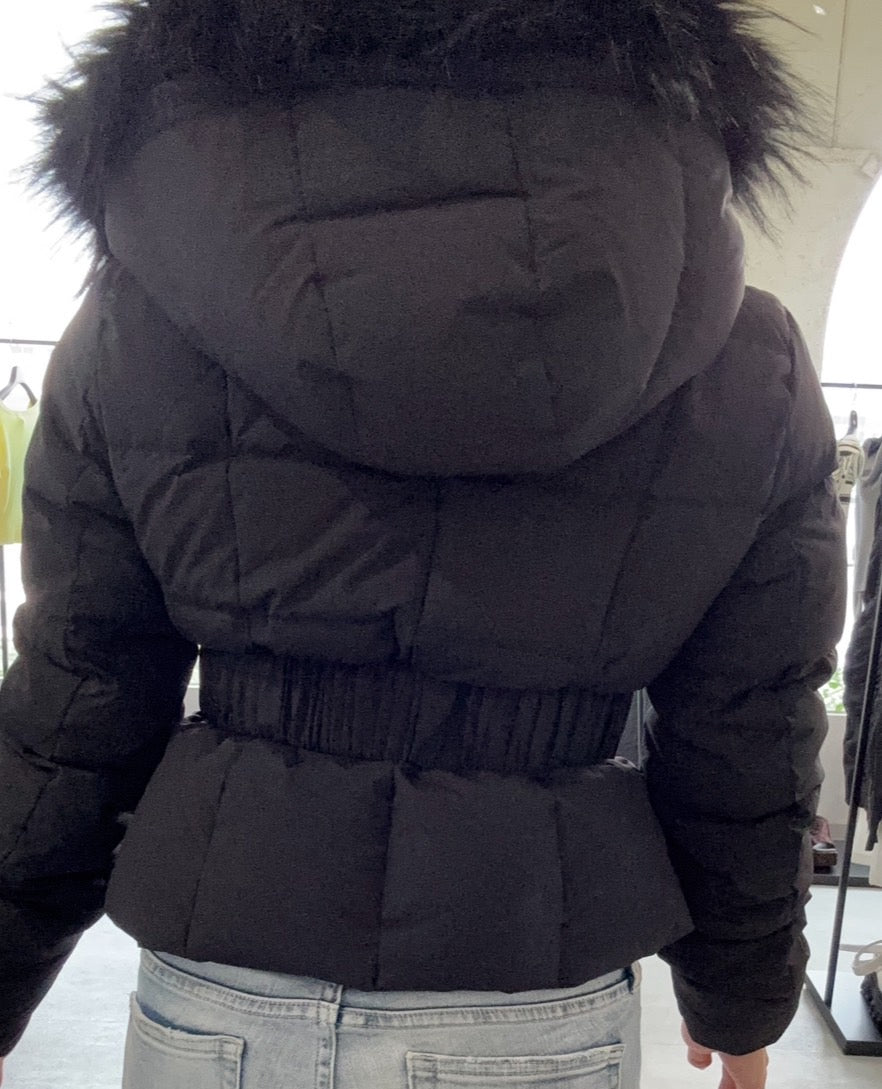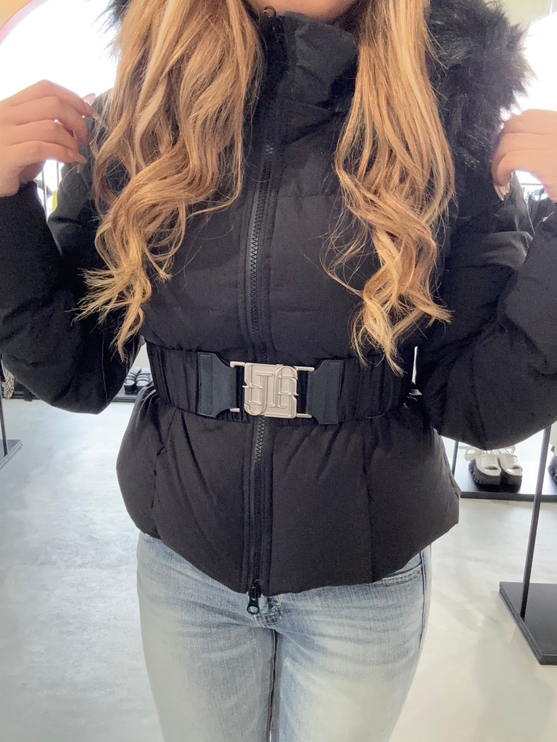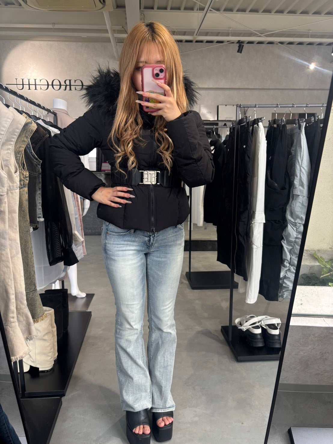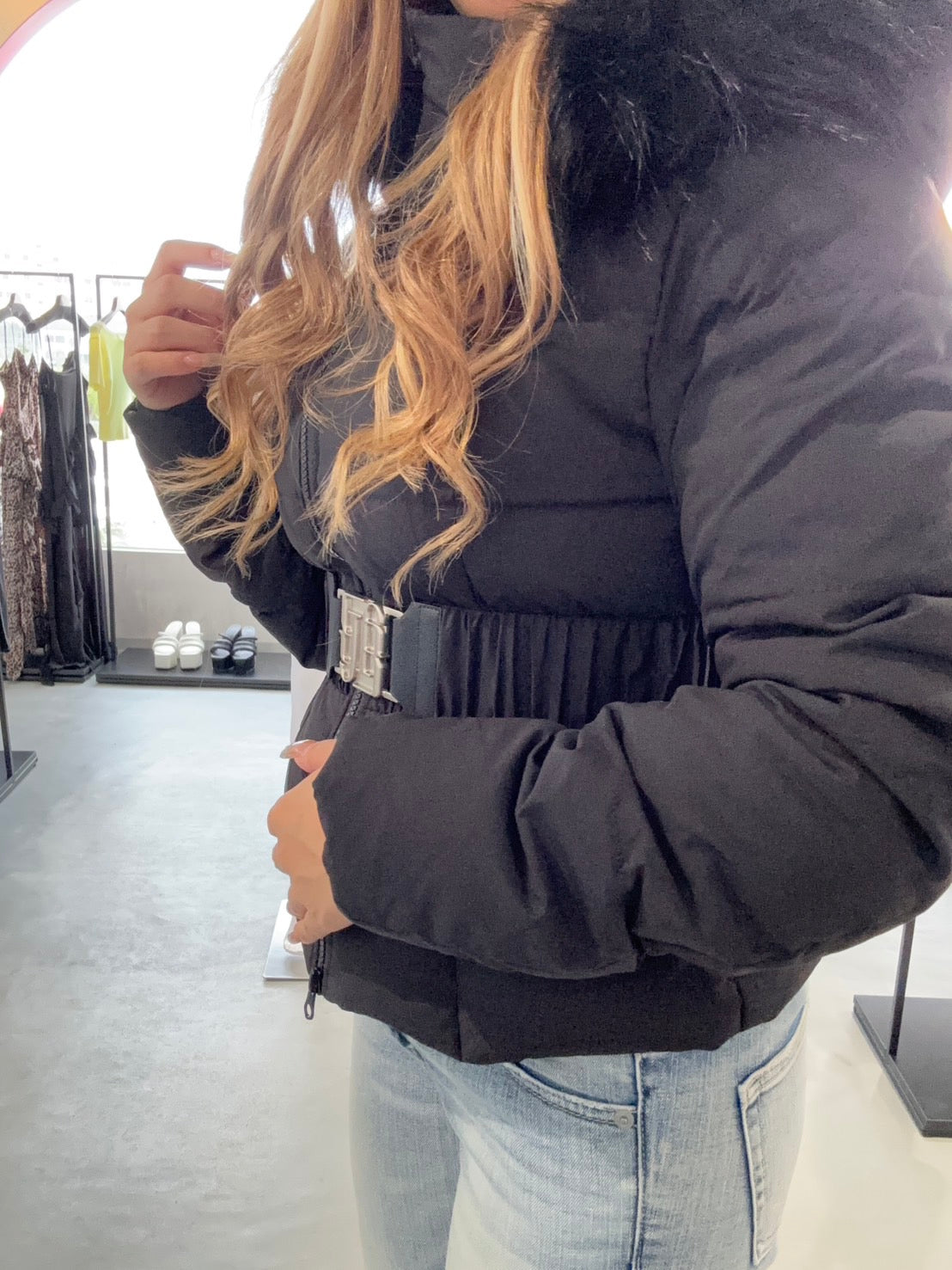 オリジナルロゴをウエストベルトに使用したショートダウンコートです。