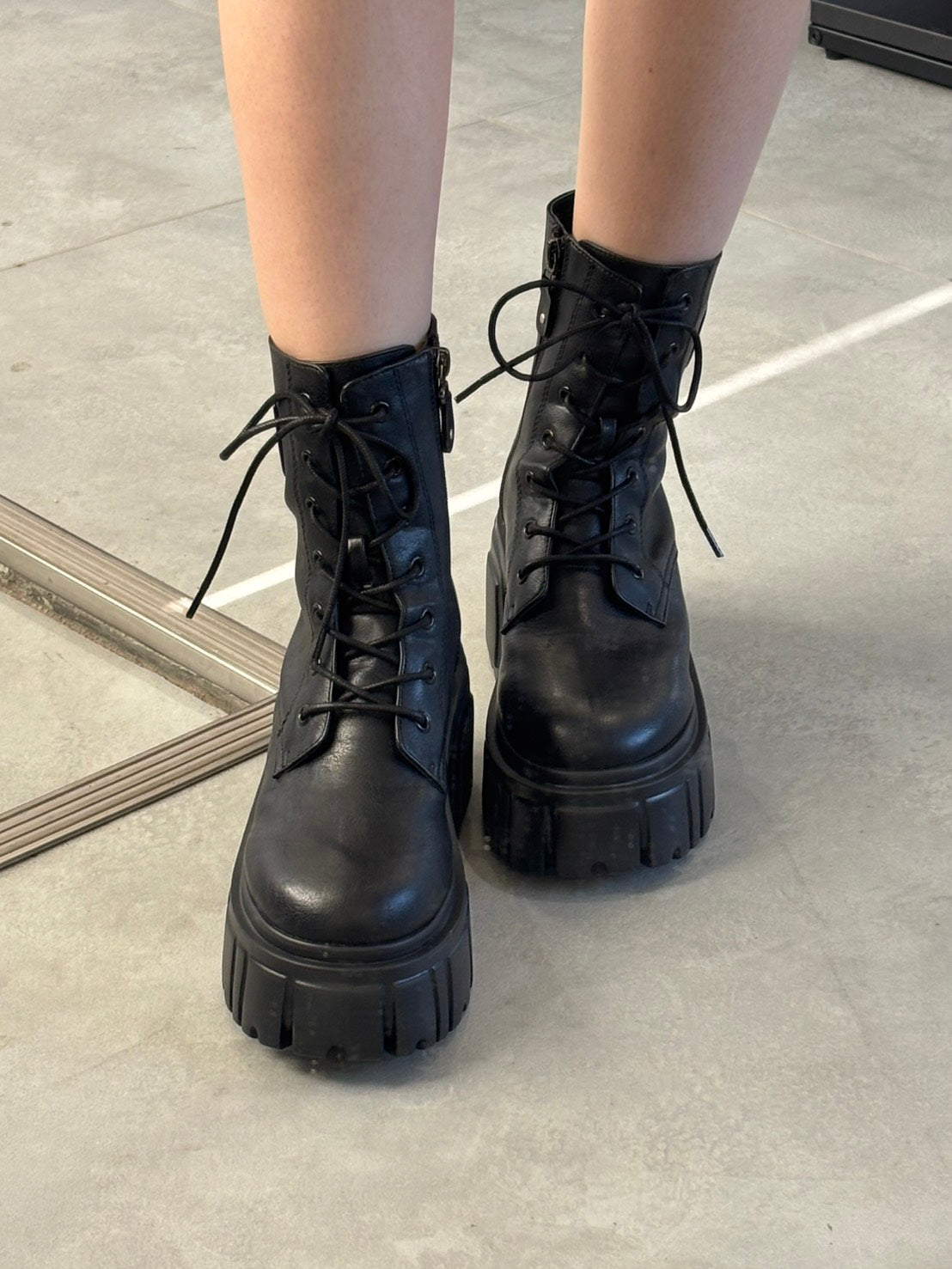 内側ファスナーで付けやすいし、レースアップでサイズ調整もしやすいです。