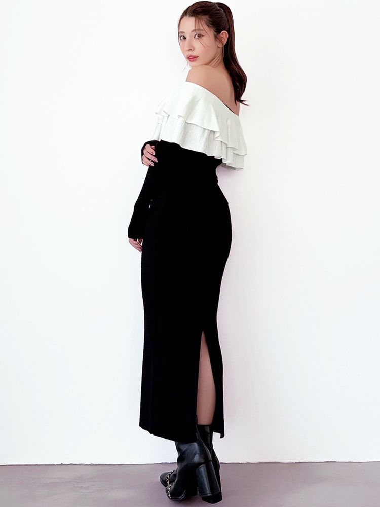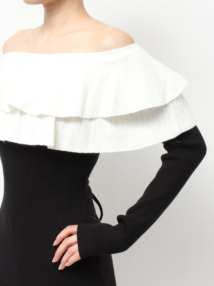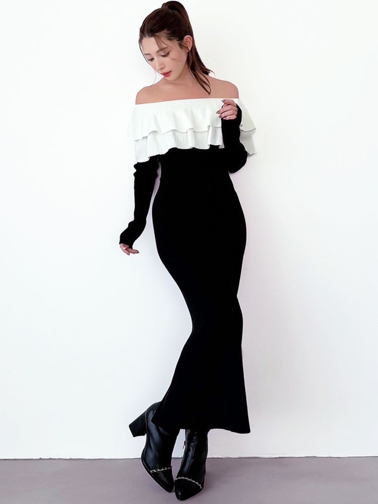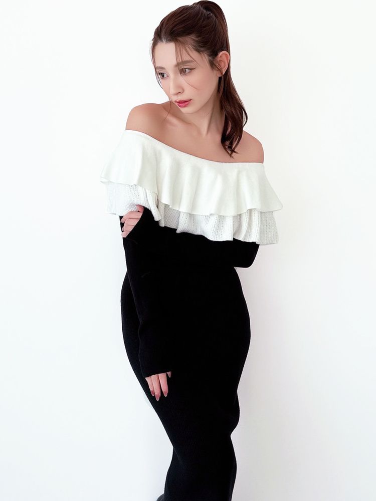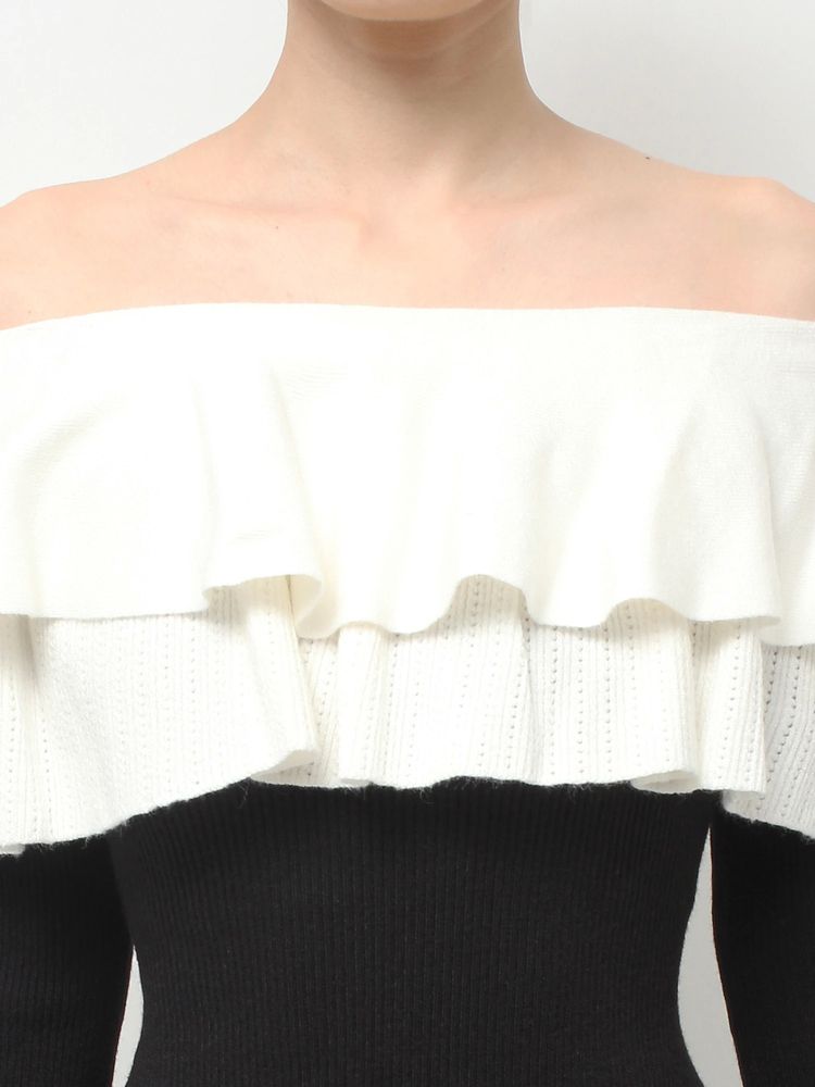 オフショルデザイン×バイカラーのフリルがデコルテをすっきり見せ