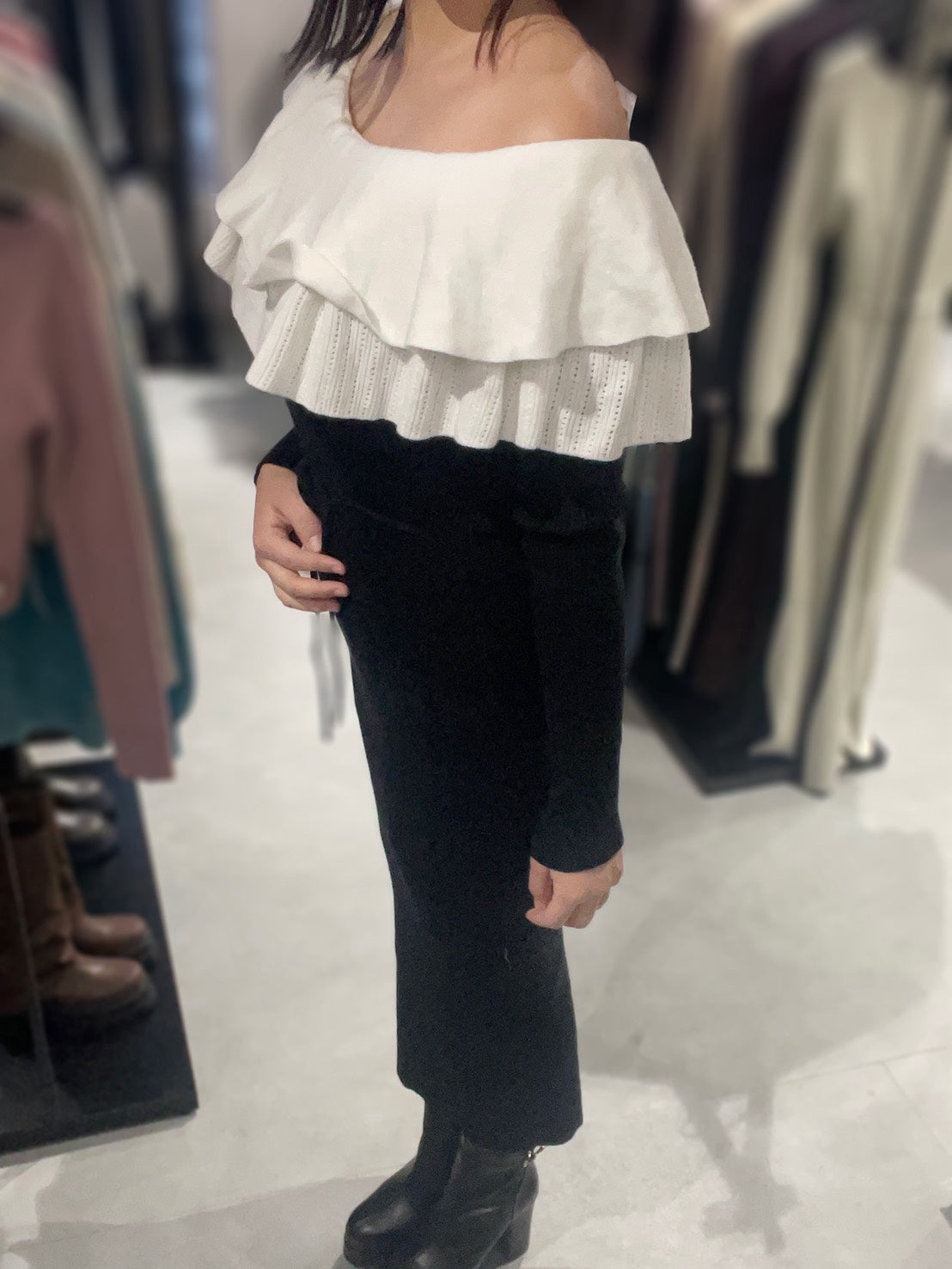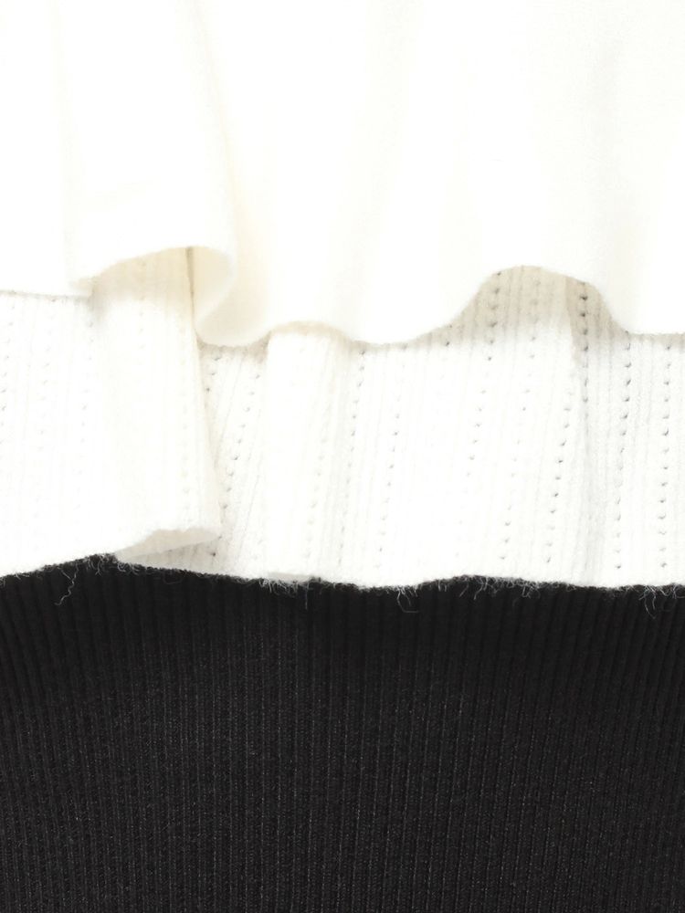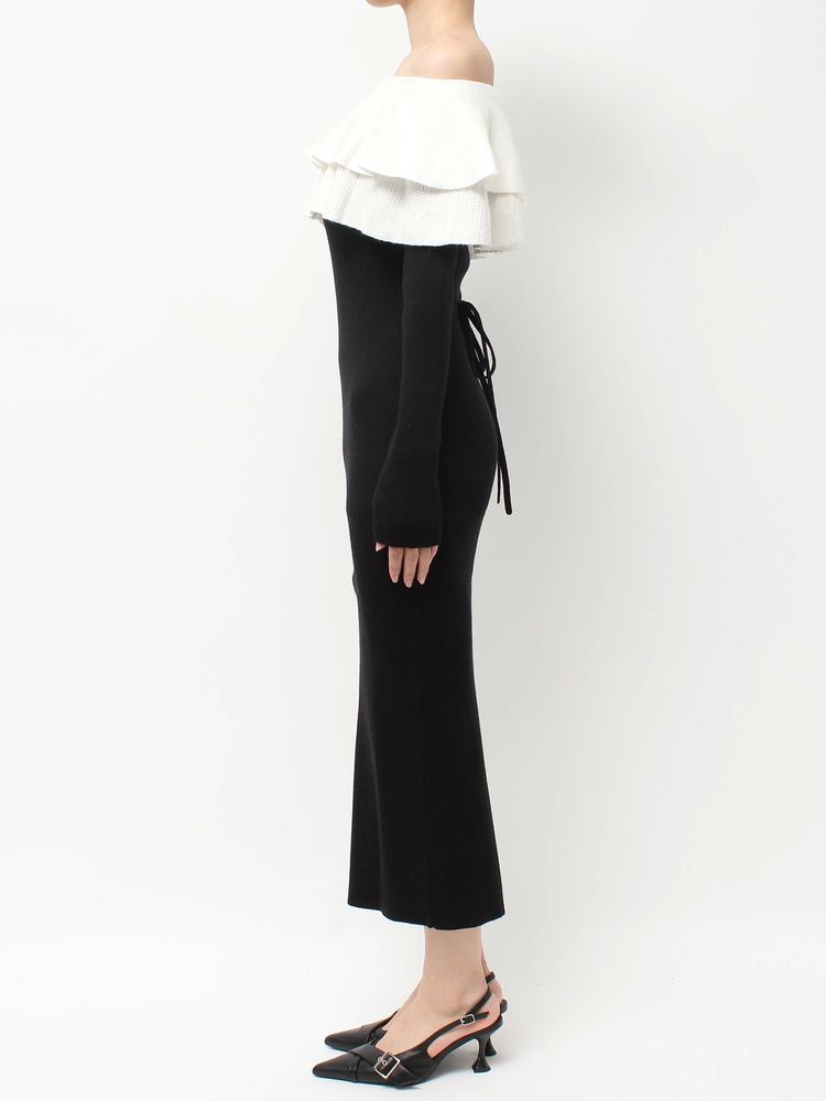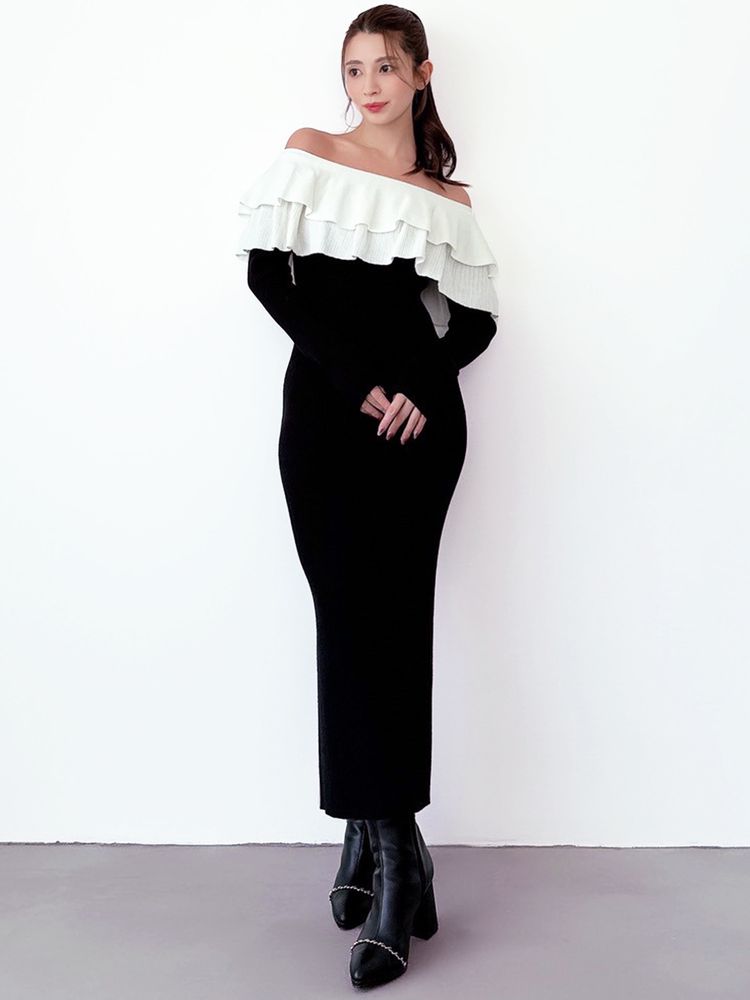 オフショルデザイン×バイカラーのフリルがデコルテをすっきり見せ