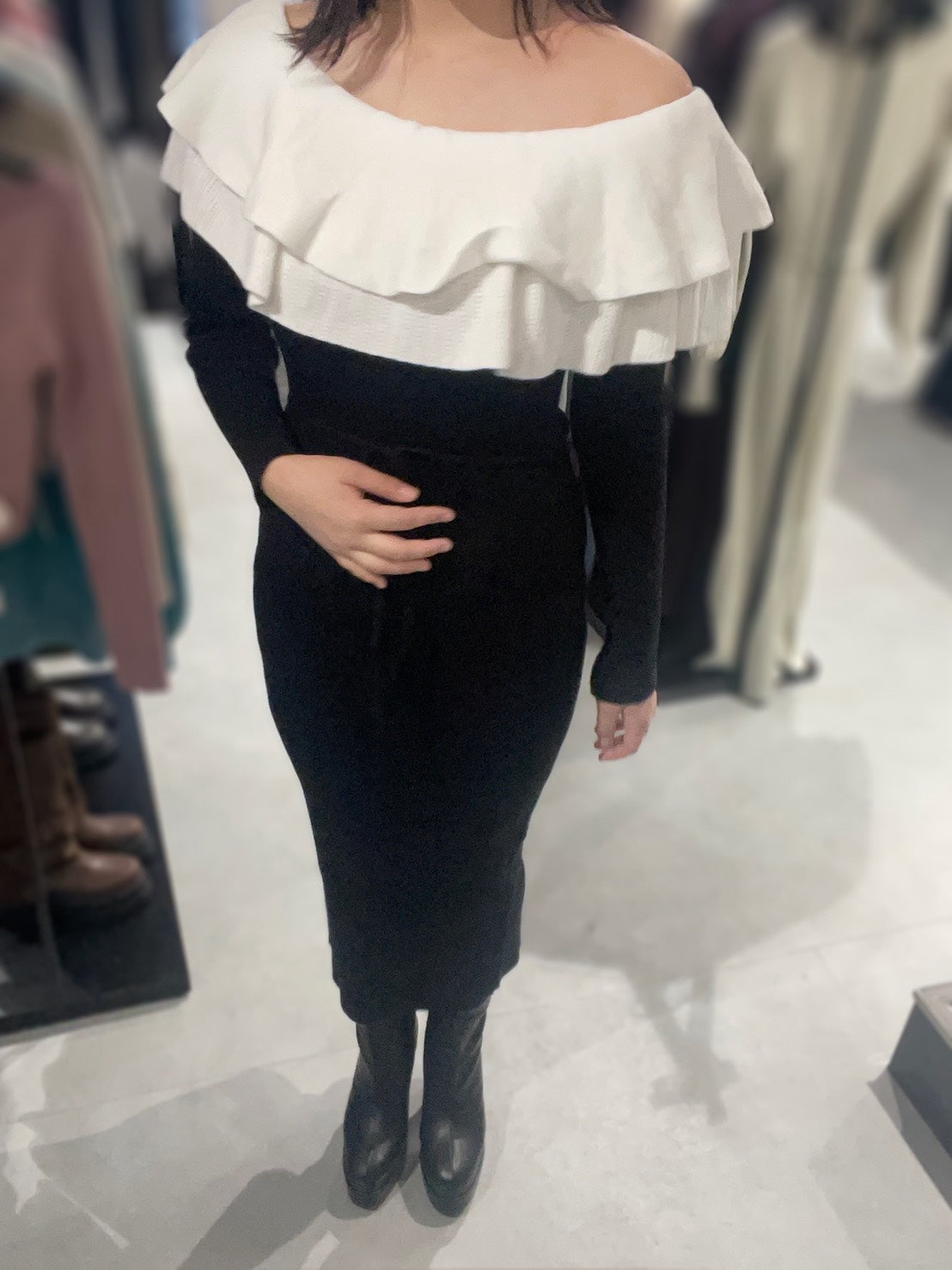 ボリュームのあるフリルが印象的なタイトワンピース