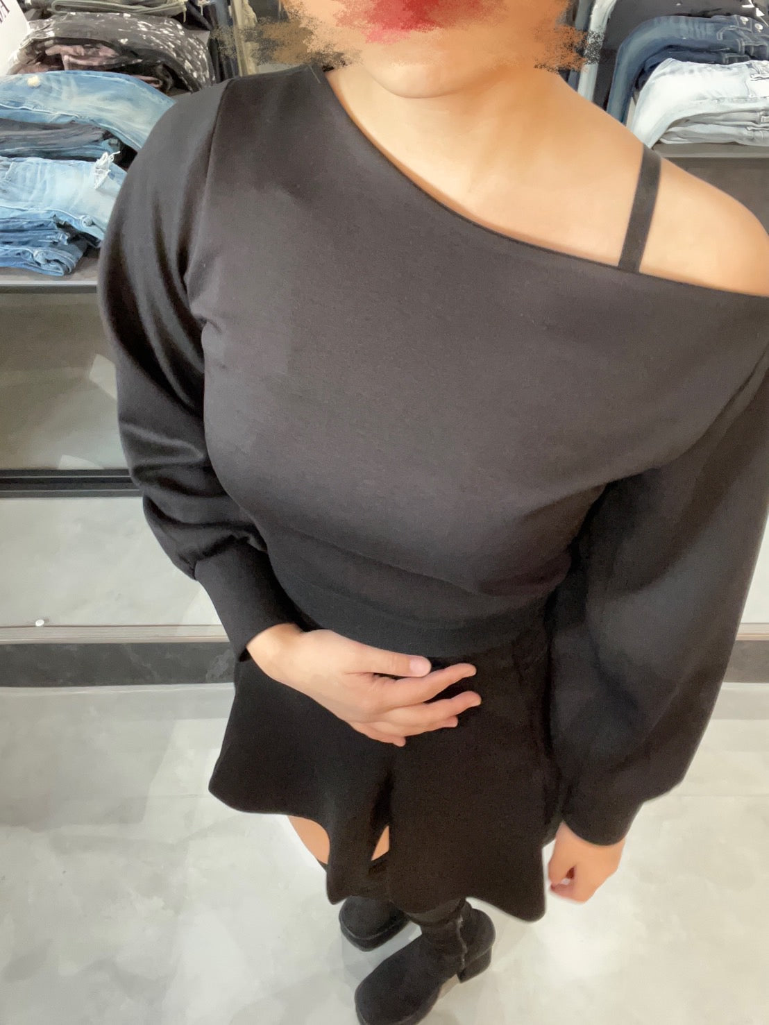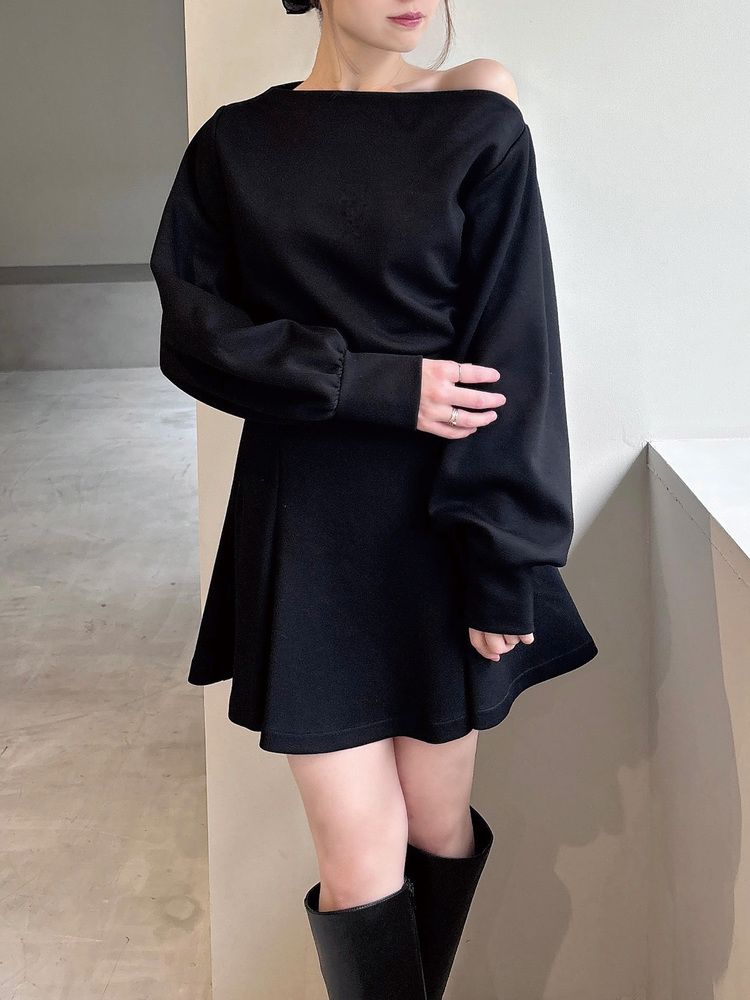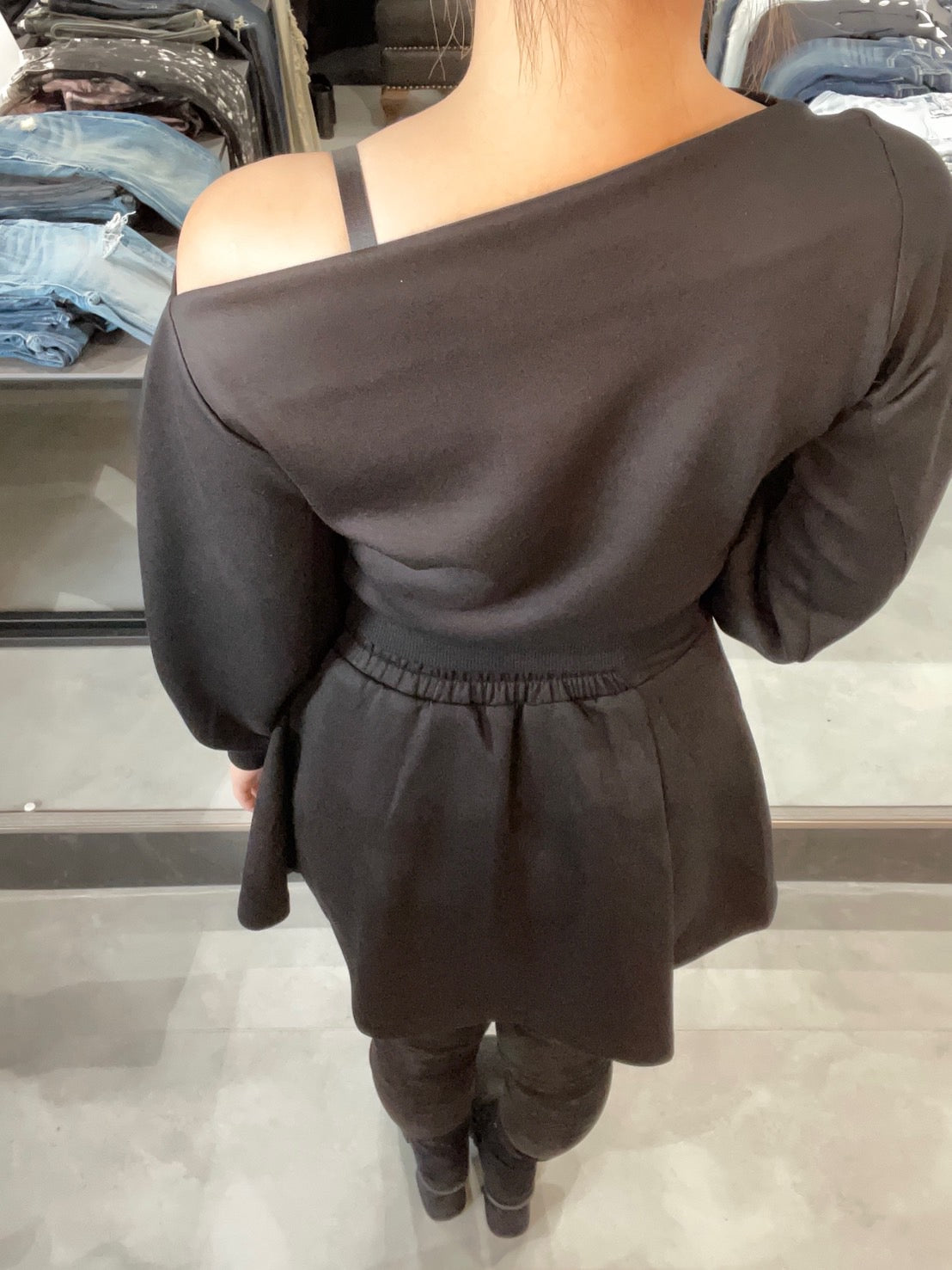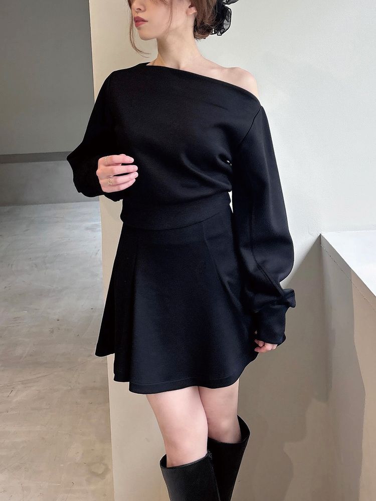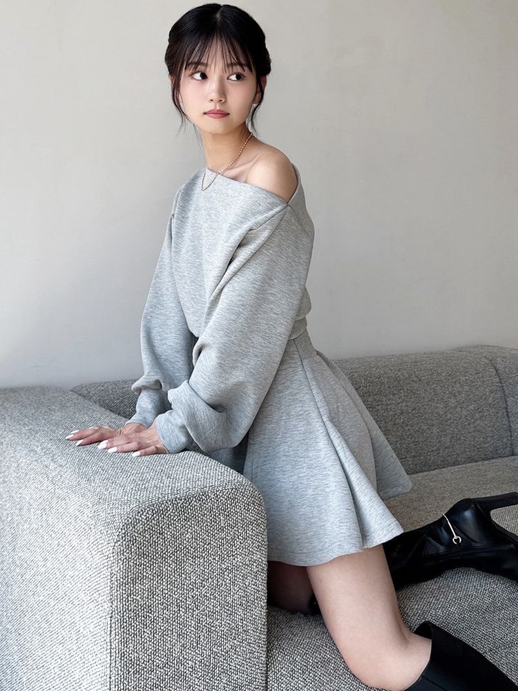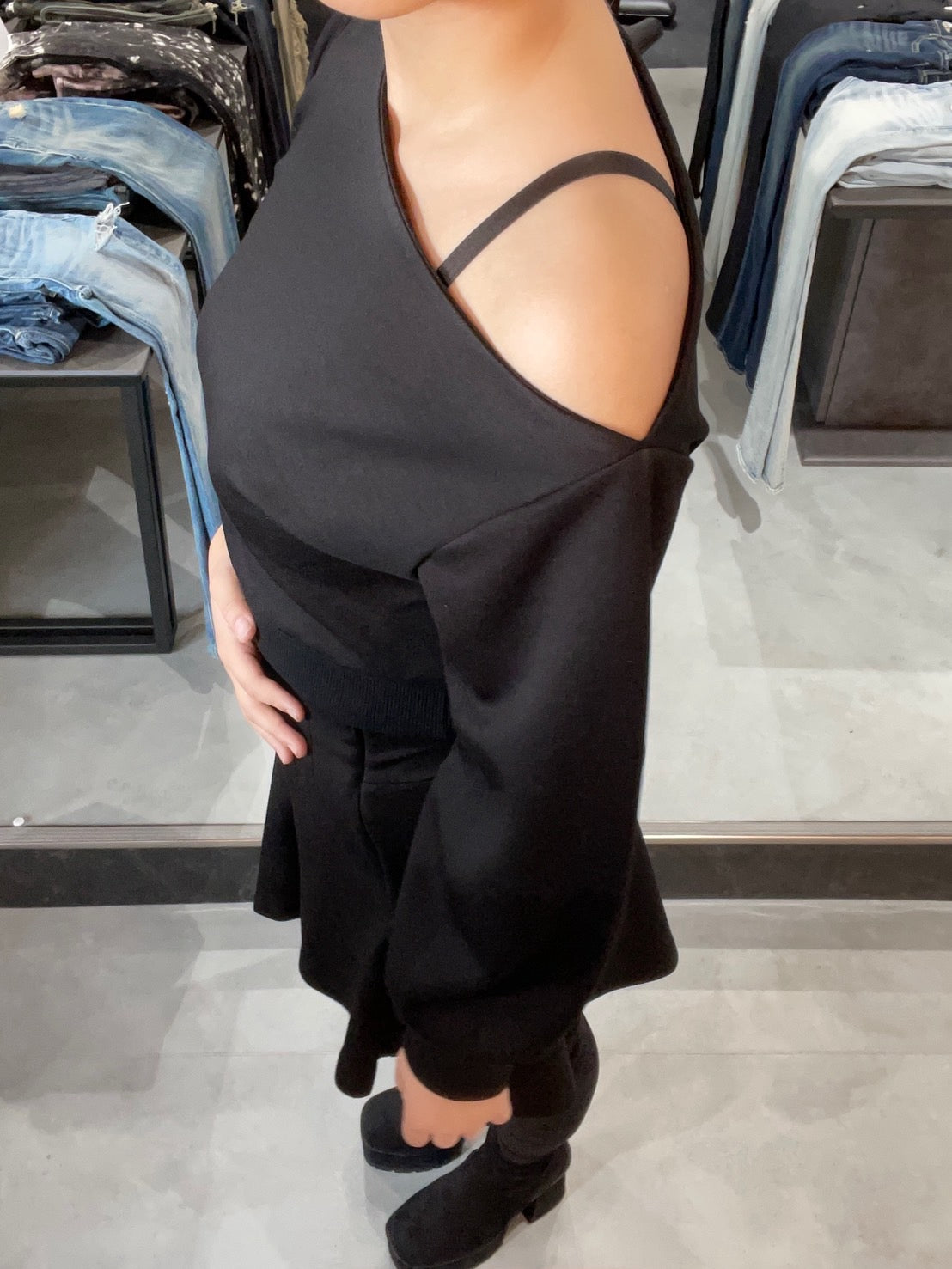 カジュアルなアイテムながらも衿ぐりをアシンメトリーにすることで